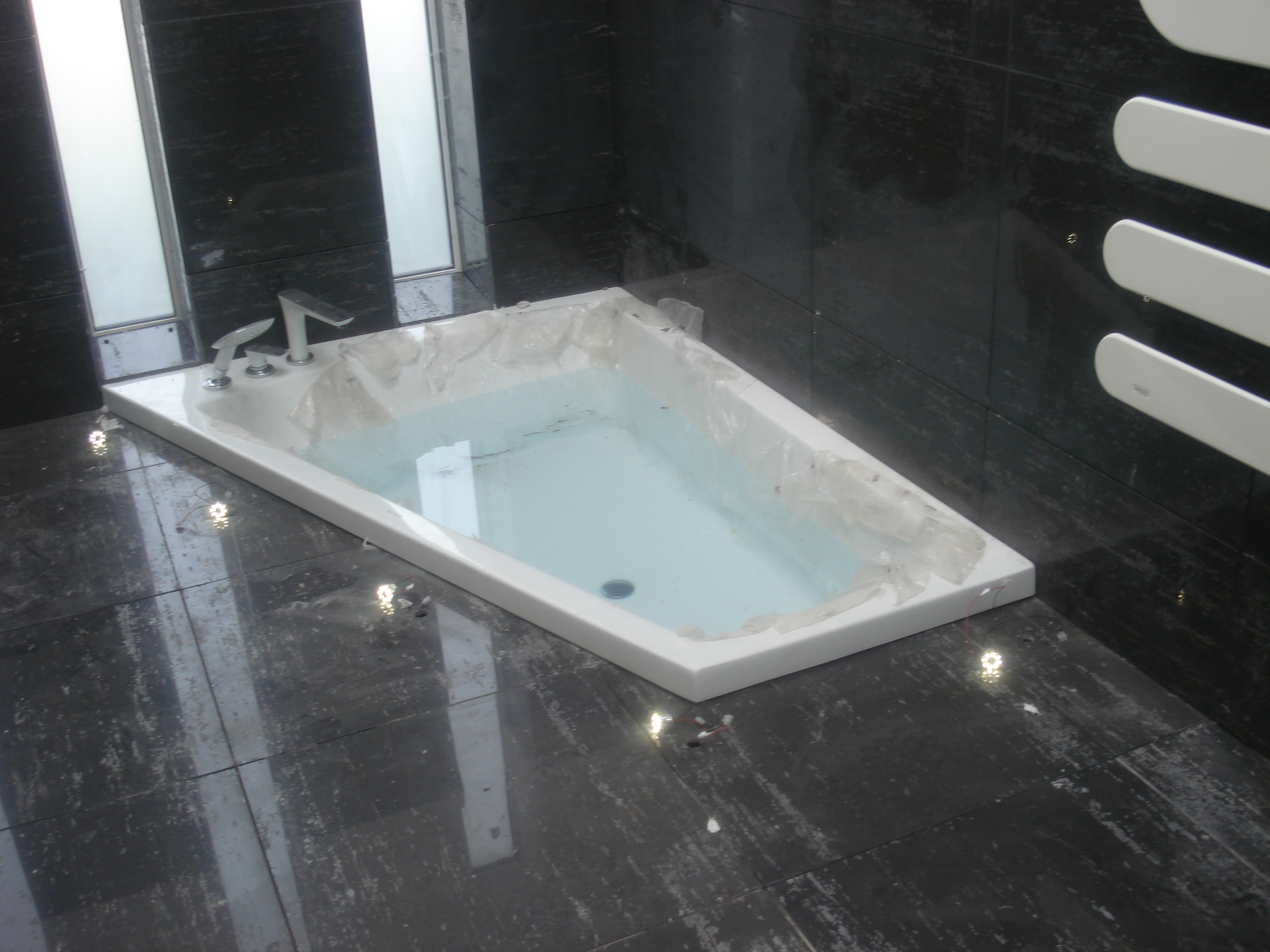 DSC07575 February 9, 2014Full resolution (3072 × 2304) ← Previous Next → Here you can see the sunkan bath and the spot lights in the floor. Italian marble flooring was used here.